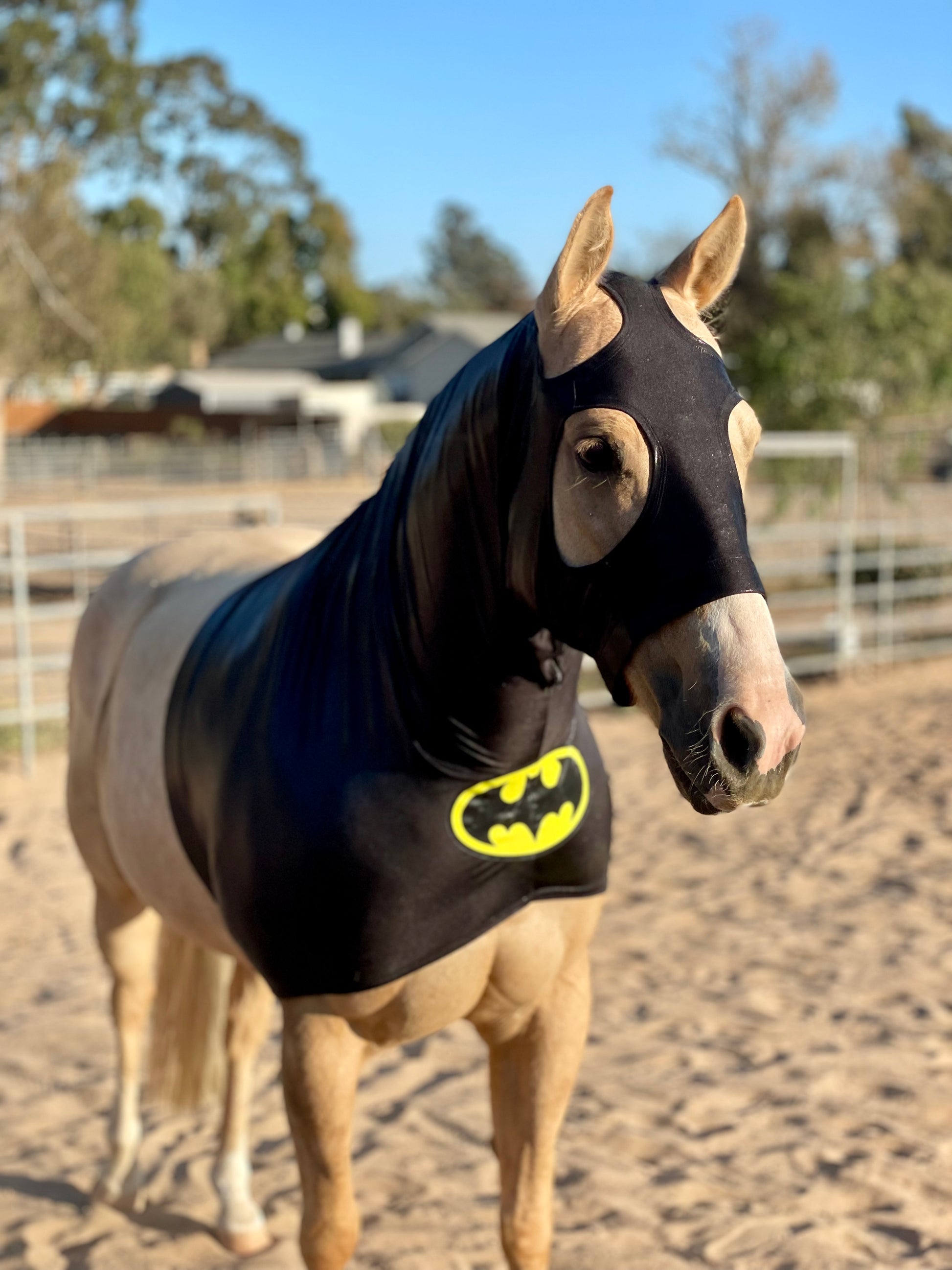 A metallic Black hood with vinyl pressed Bat man Logo on the chest.