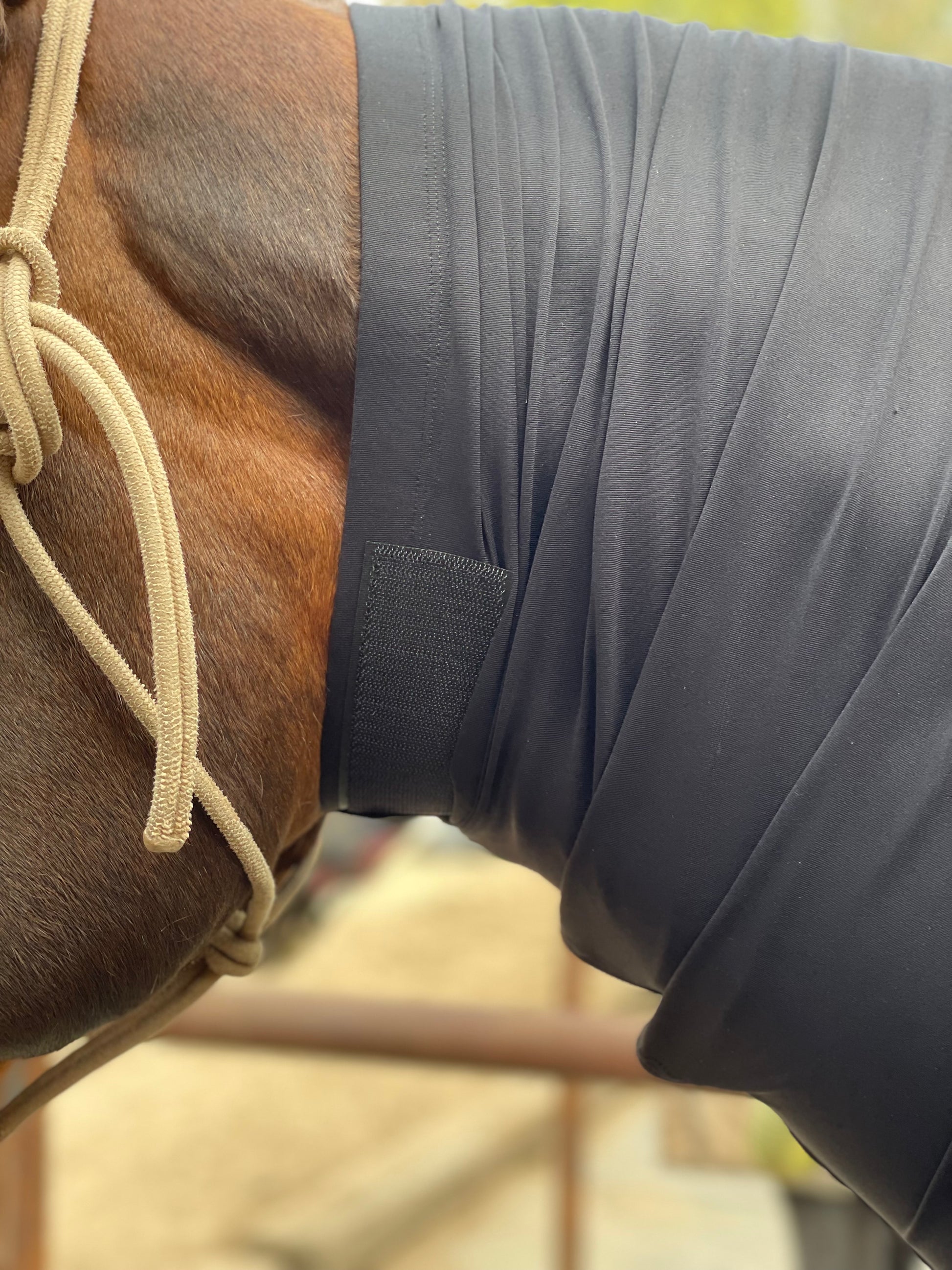 Slick Horseware’s newest faceless sleazy in a classic black matte finish. Wide Velcro bellyband, full separating YKK zipper from jaw to chest, 1" reinforced elastic at the neck line to prevent sliding down, and dual adjustable elastic leg straps that are removable and replaceable. Integrated panel between shoulder and neck to increase freedom of movement and hip and shoulder gussets for a contoured fit.