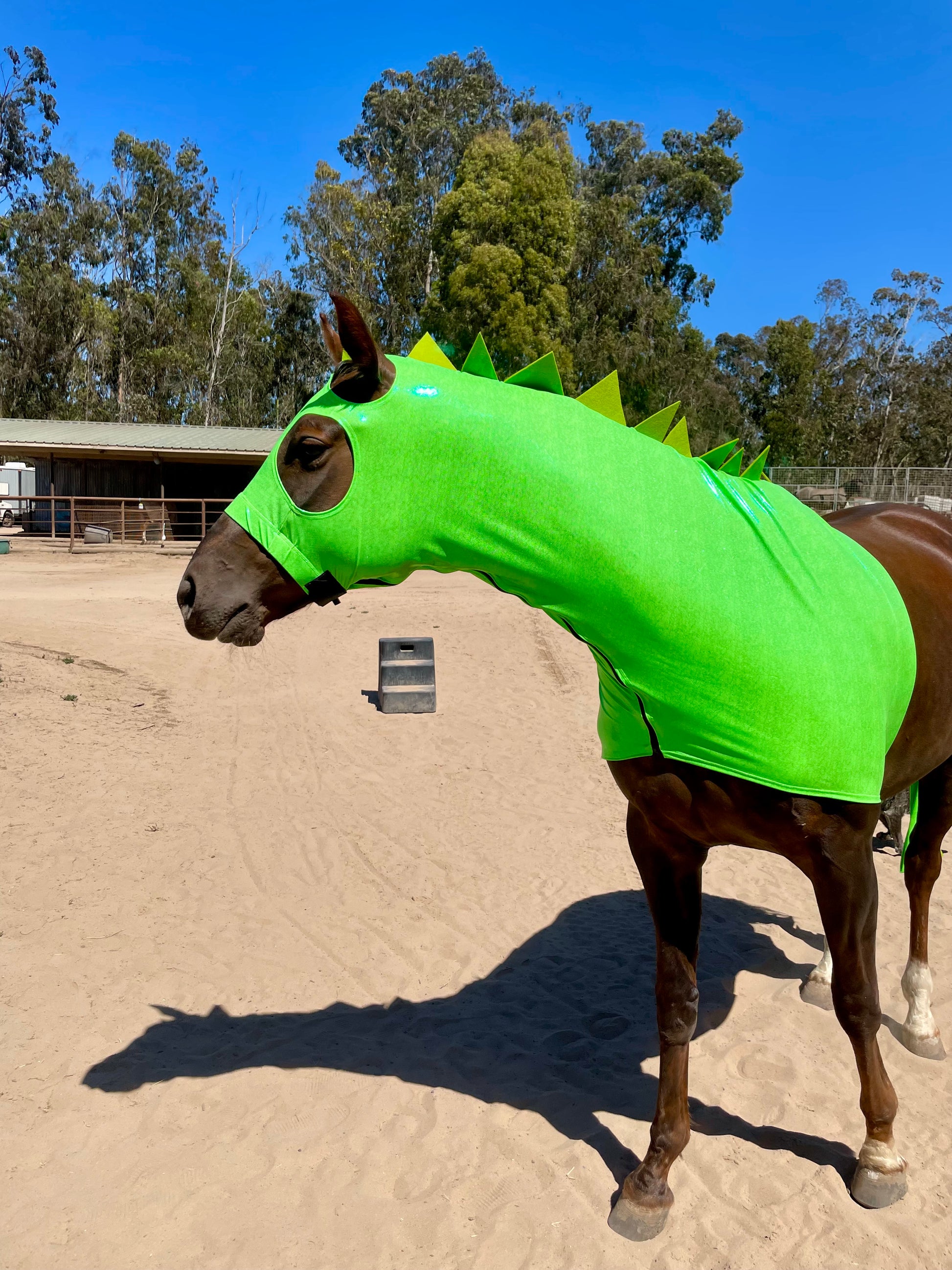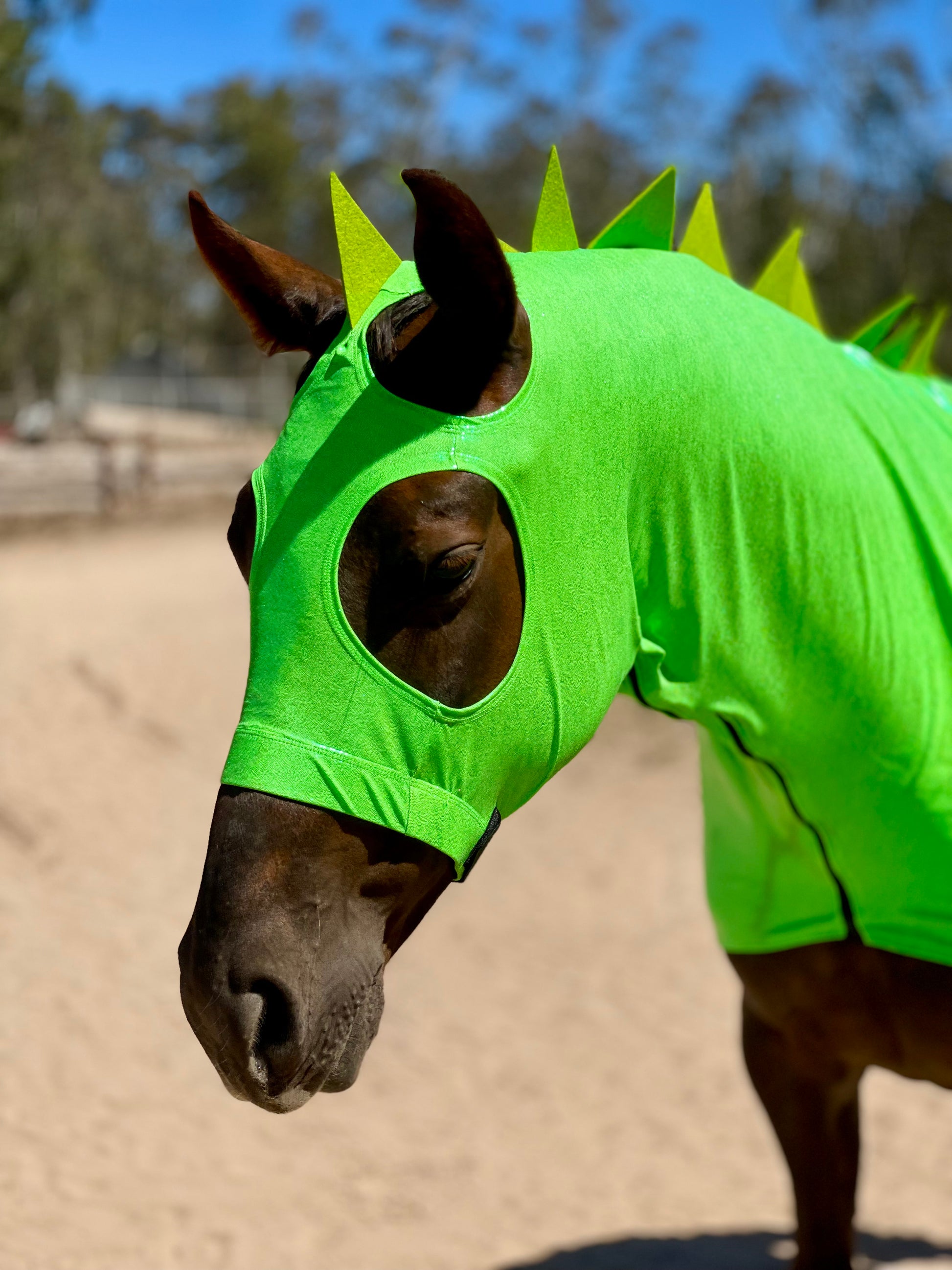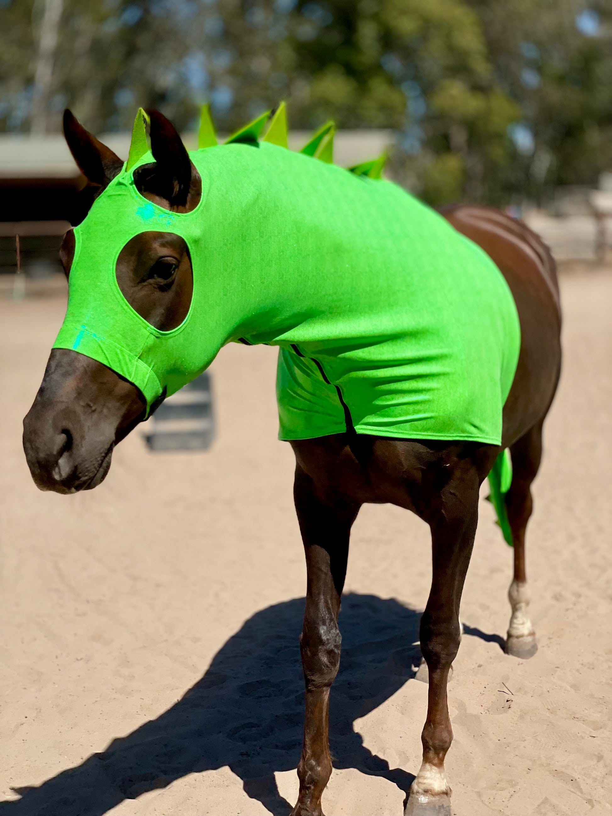 Perfect for yoiur next costume class! A green Dragon Horse Costume with heavy duty felt dragon spikes sewn on along the mane. Elastic noseband and 3” heavy duty elastic bellyband with Velcro closures and a full separating YKK zipper. Adjustable Velcro noseband closure and bellyband. Matching dragon spike Tailbag included. This horse costume is well made and safe to ride in!
