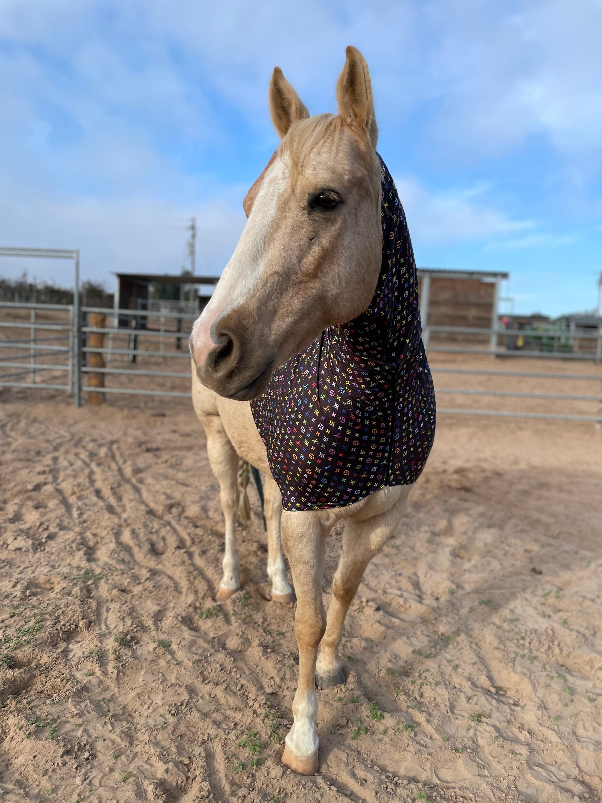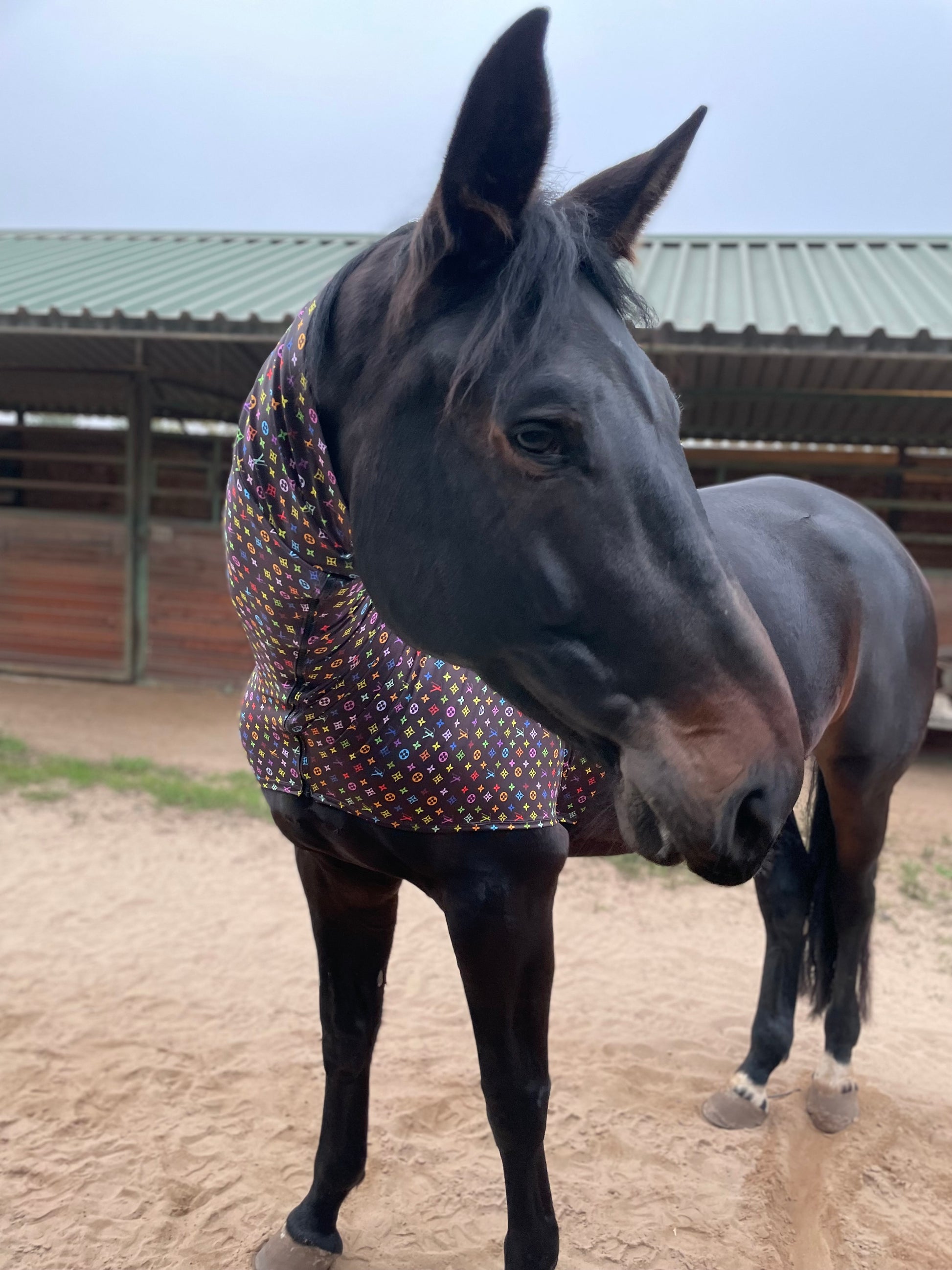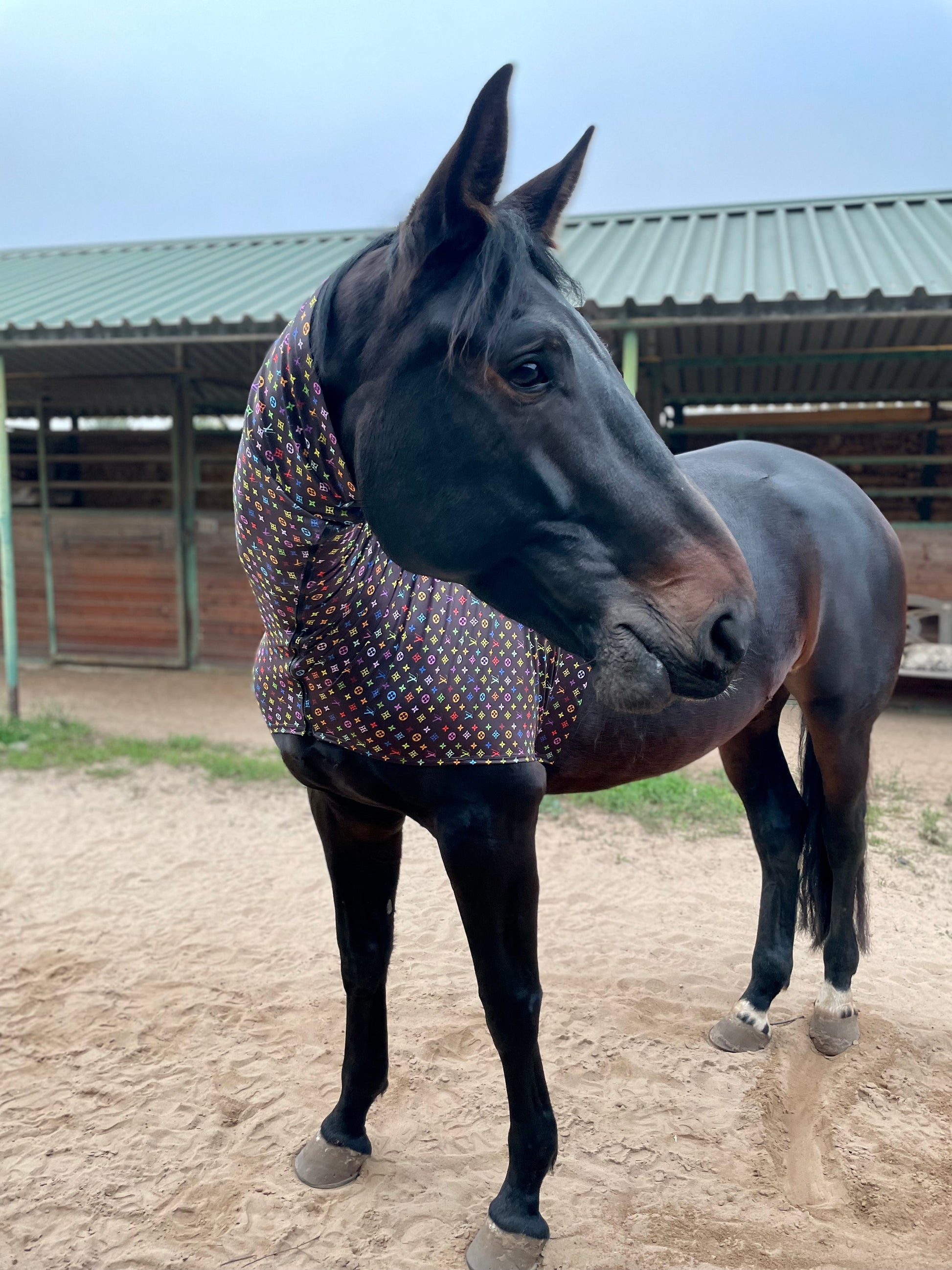 **Horse in photo is 1200 lbs, 16.1 Warmblood wearing size 78” blanket is wearing a LARGE hood.**