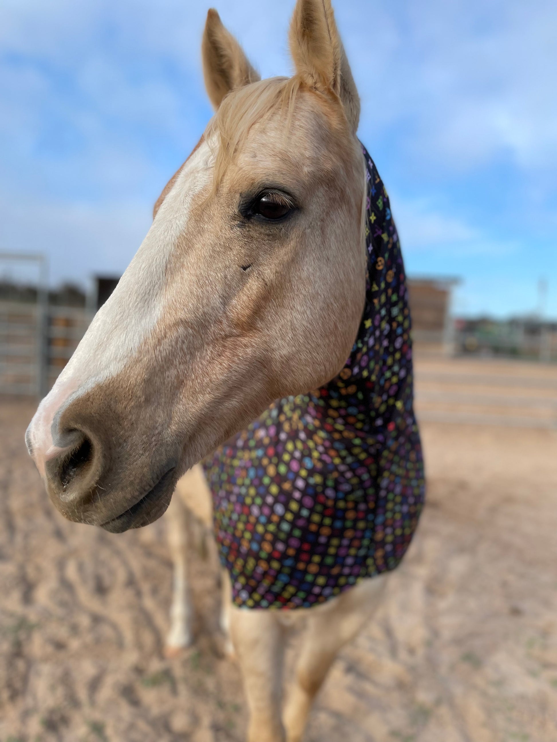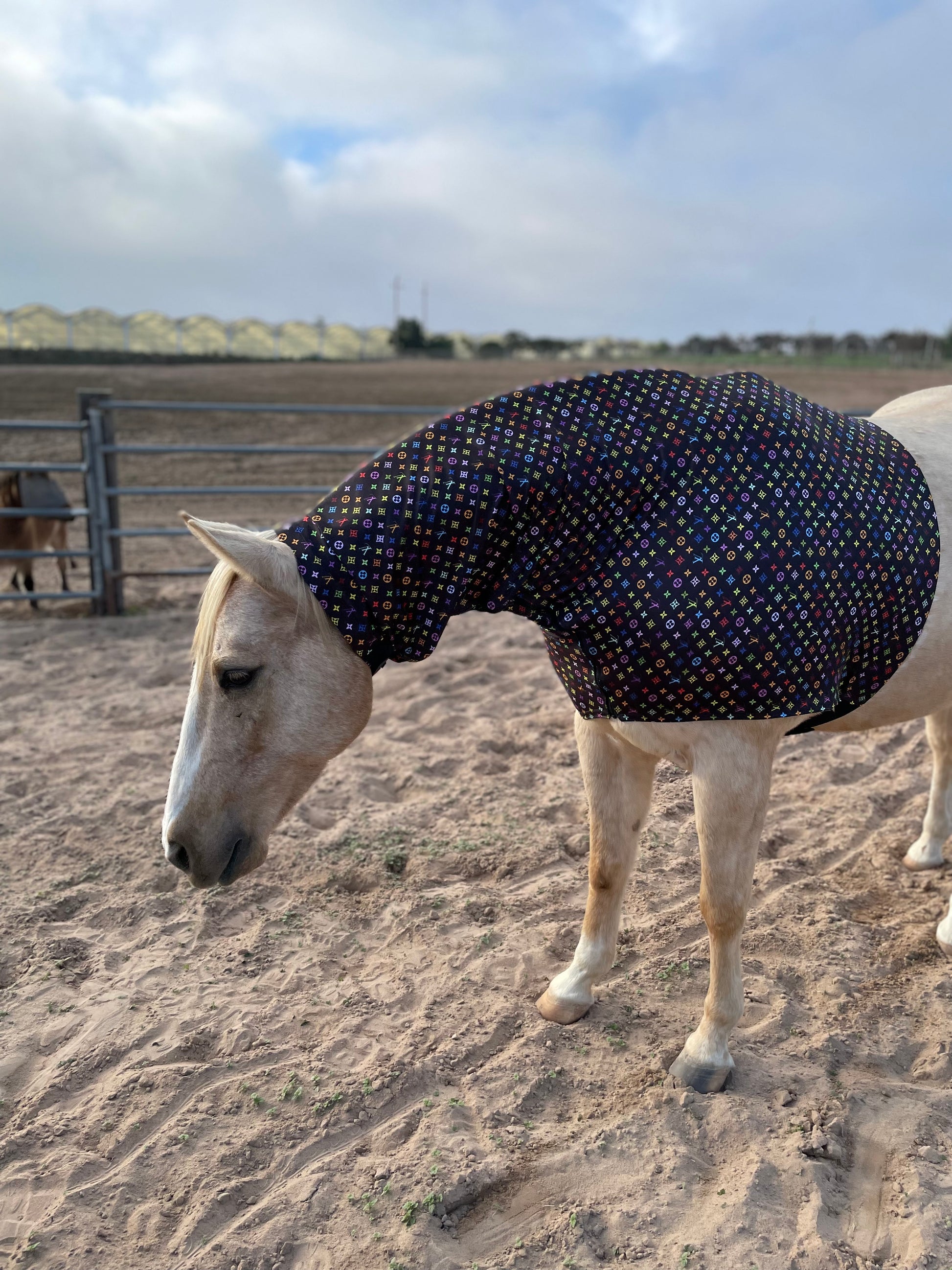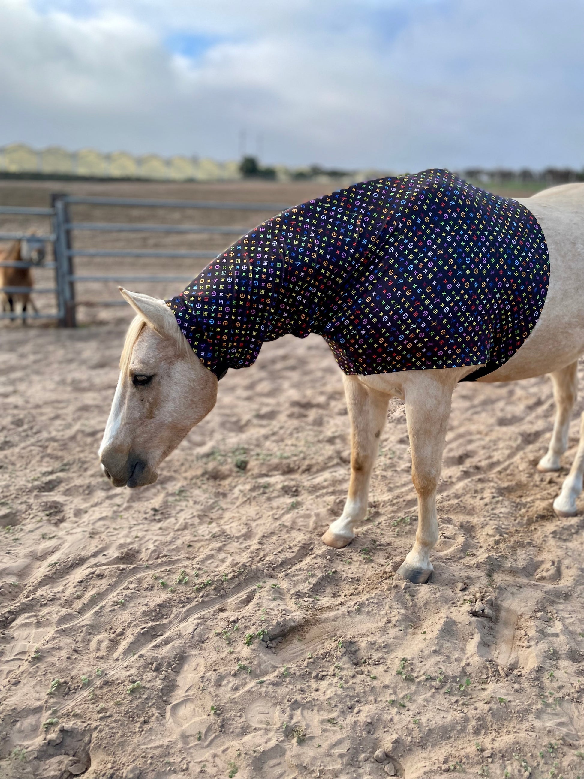 **Horse in photo is 1200 lbs, 16.1 Warmblood wearing size 78” blanket is wearing a LARGE hood.**