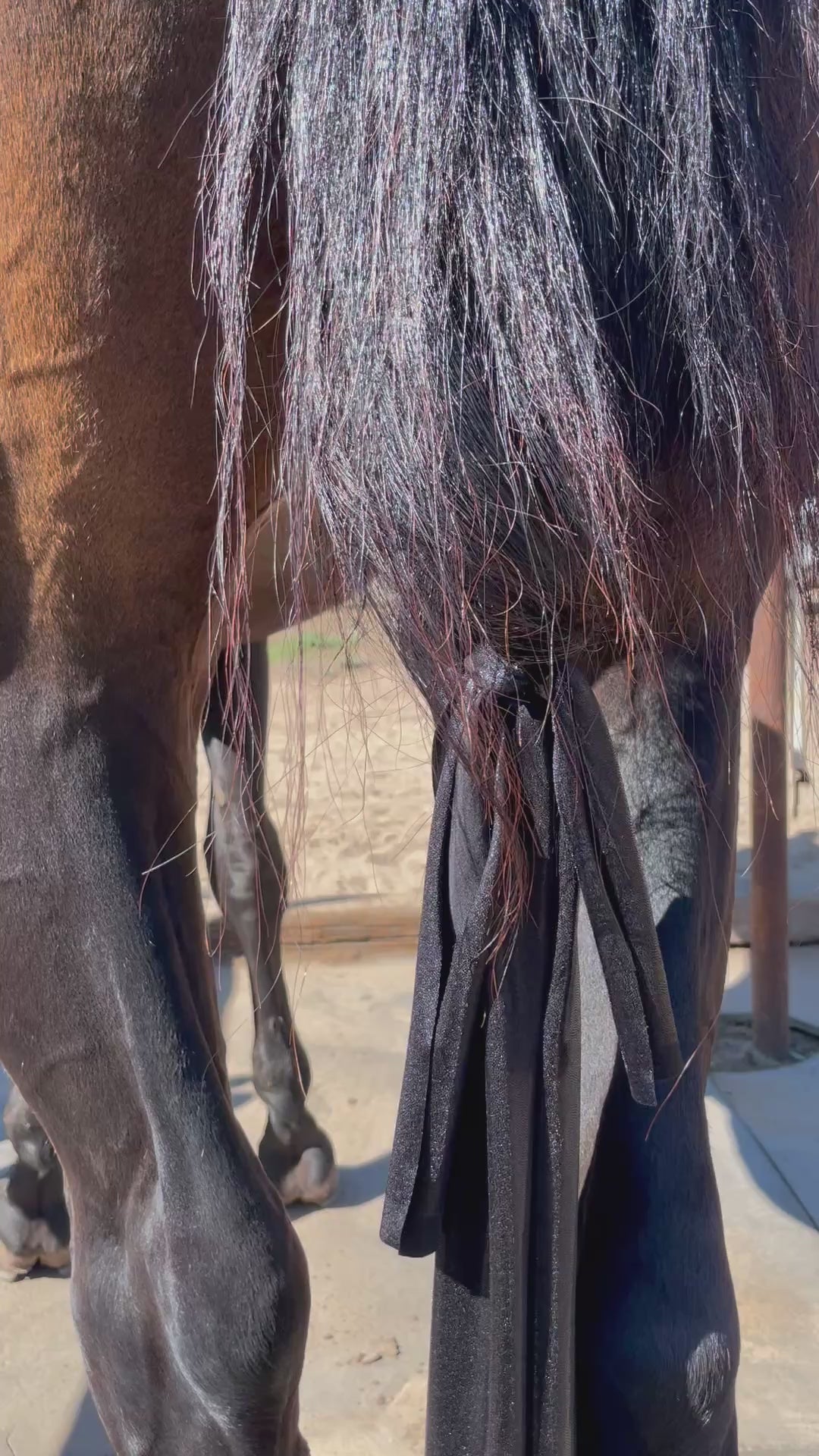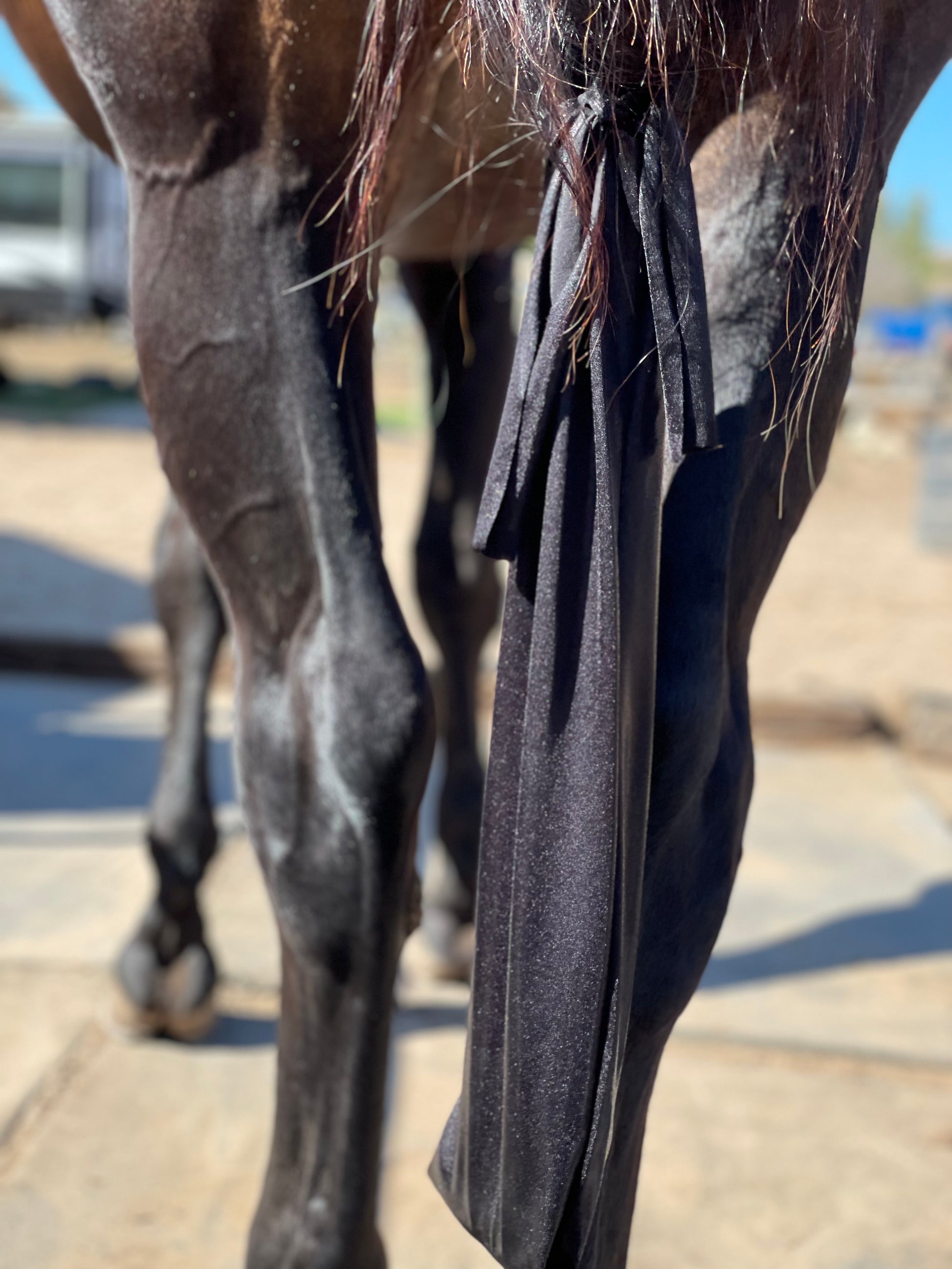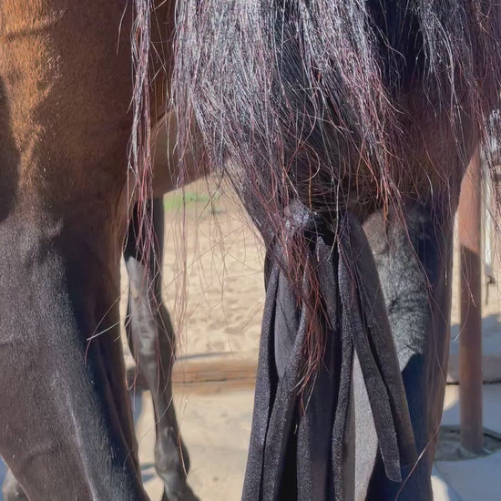 Medium-heavy weight lycra tailbag with 2 top ties that easily thread through braids. Ties are 9” long and the bag itself is approximately 6.5” wide and 22” in length.