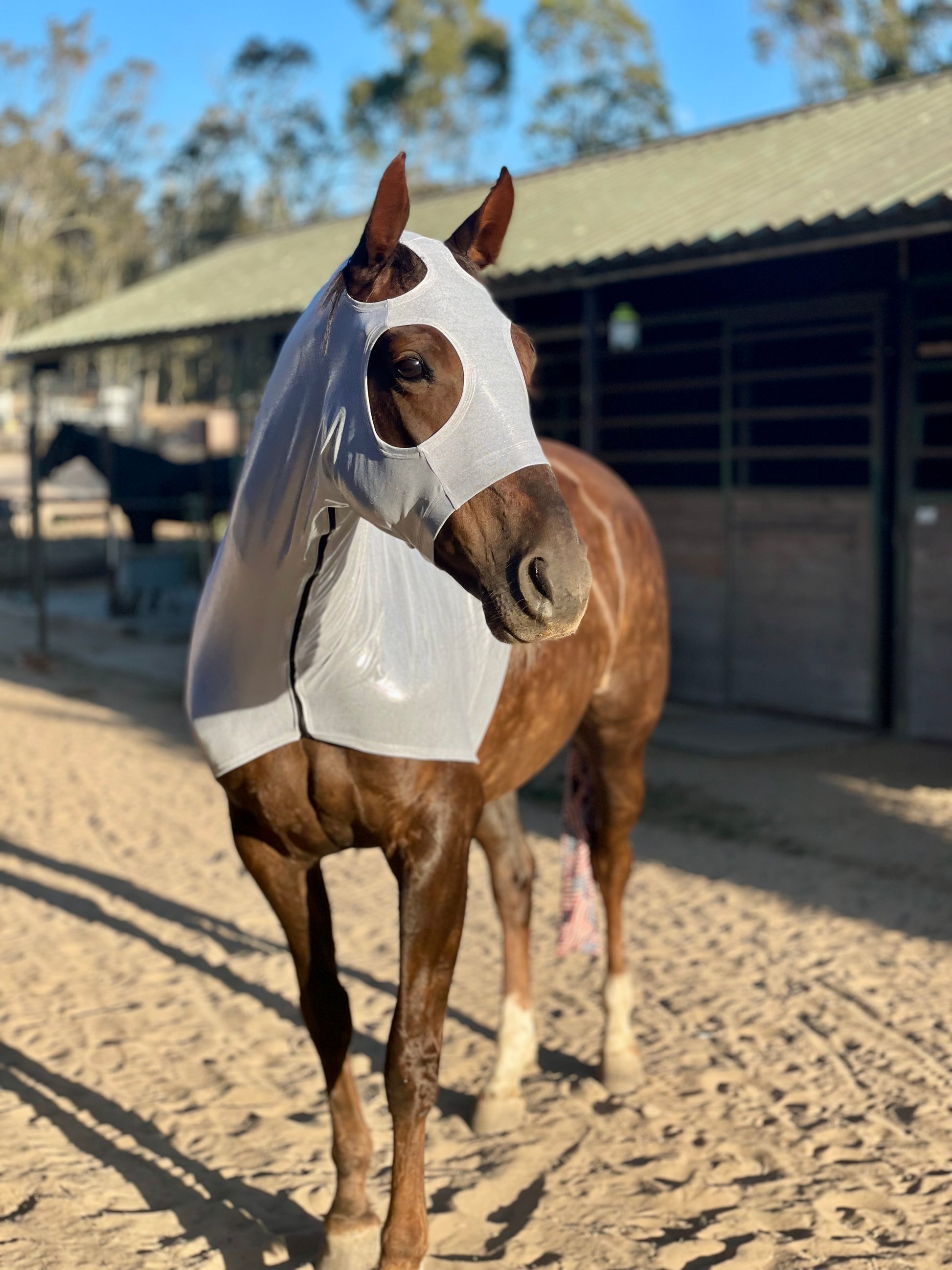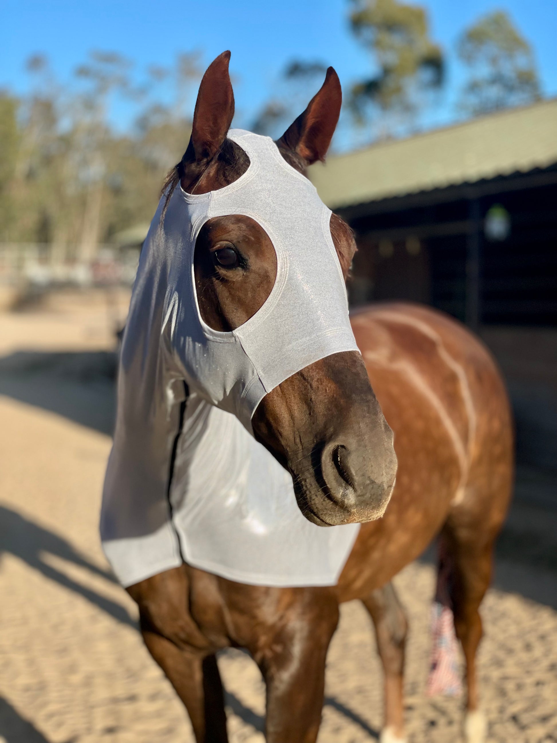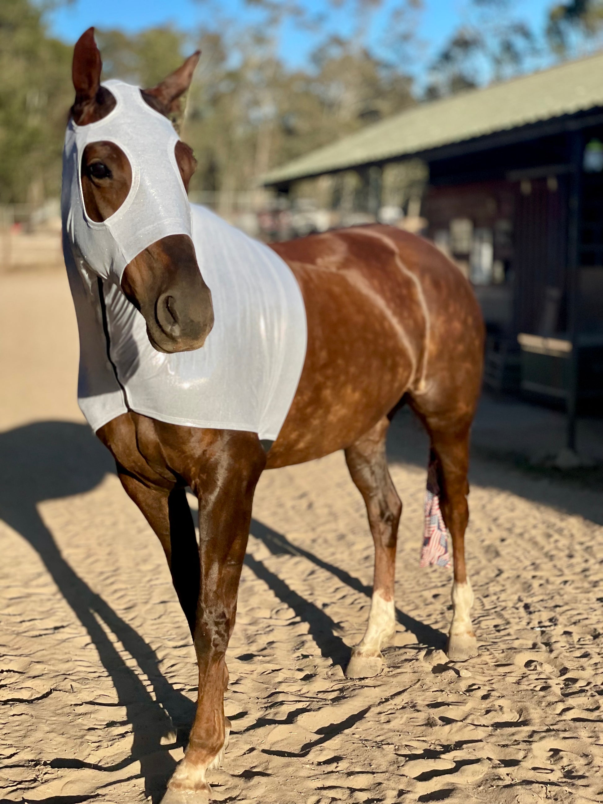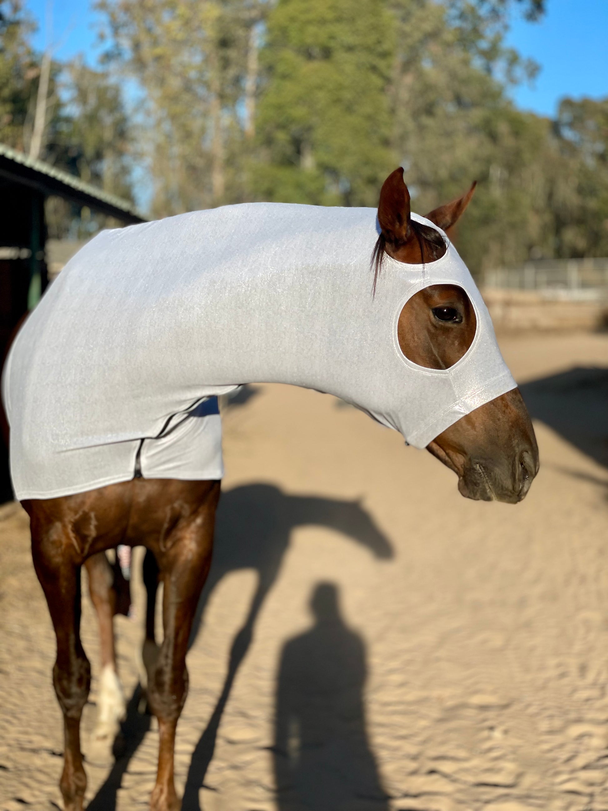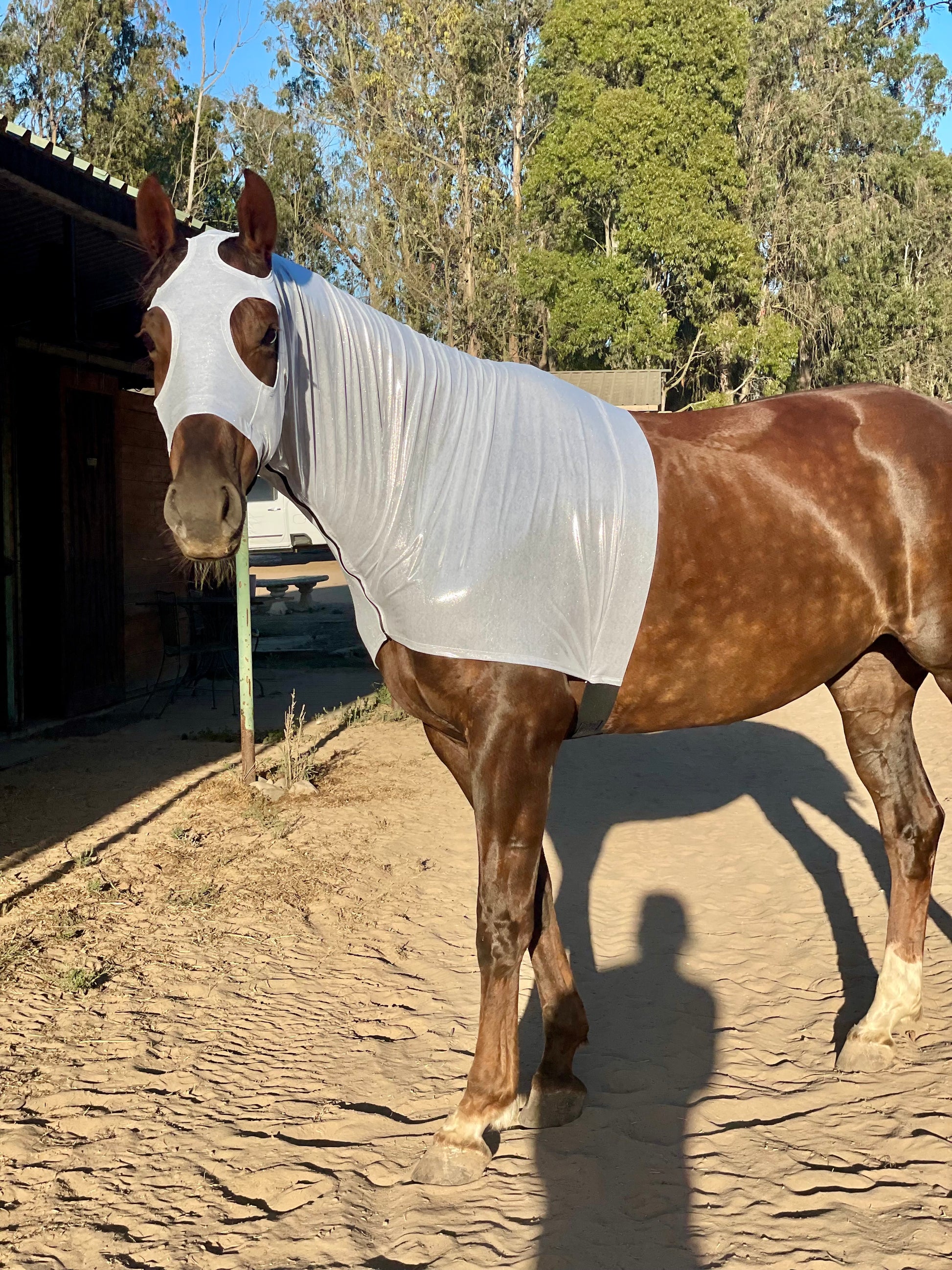 Medium-heavy weight 320g Nylon Lycra with Generous shoulder lengths to prevent rubs when used used under blankets. Full Separating YKK zipper from chin to chest, adjustable fit 1.5" noseband with Velcro closure, large eye holes, and heavy duty velcro and elastic bellyband.