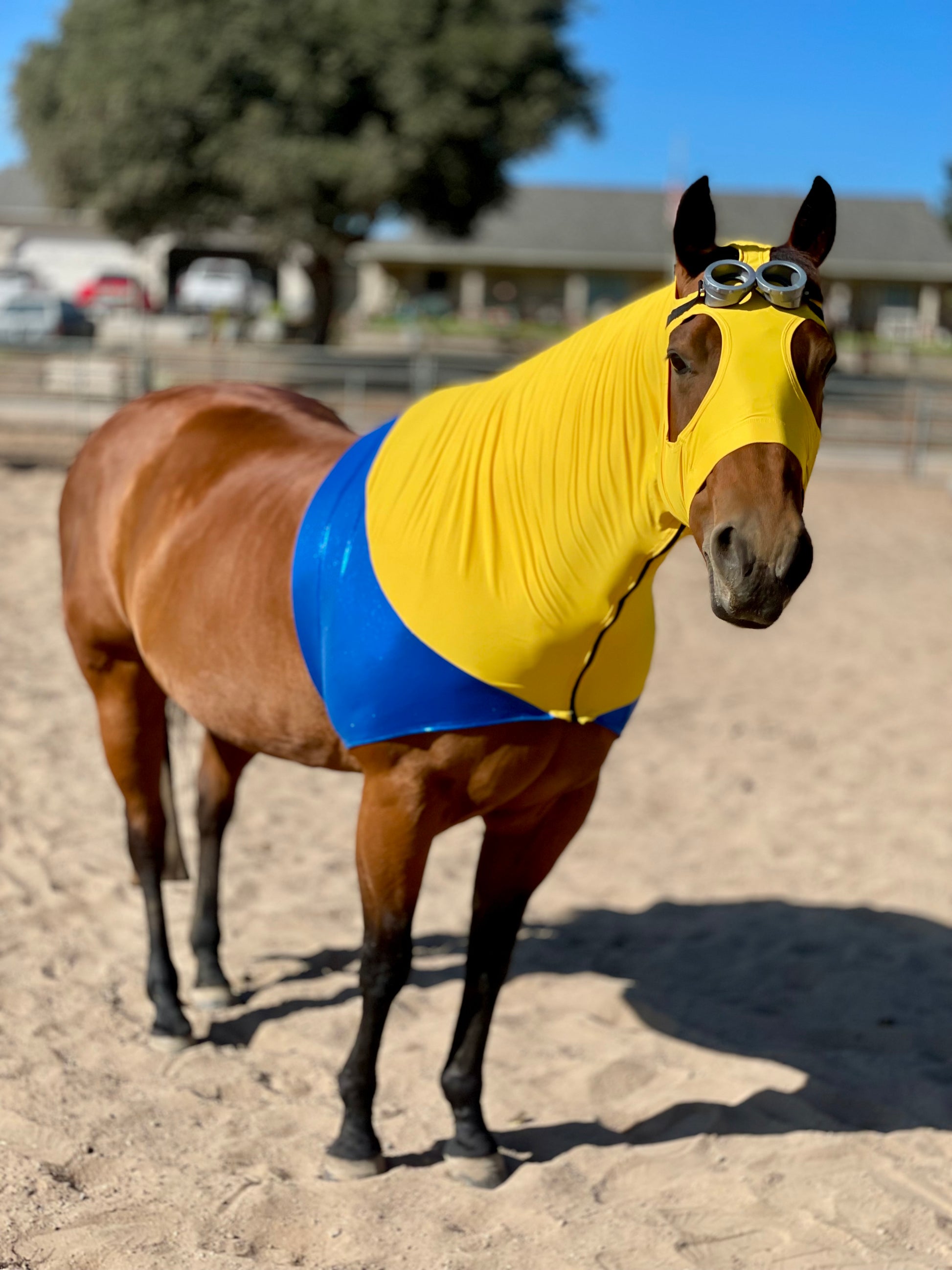 Minions Horse costume is handcrafted with the highest quality fabrics and materials. This costume is Accented with adorable goggles sewn on with elastic above the eyes. Perfect for your next costume class or Halloween!