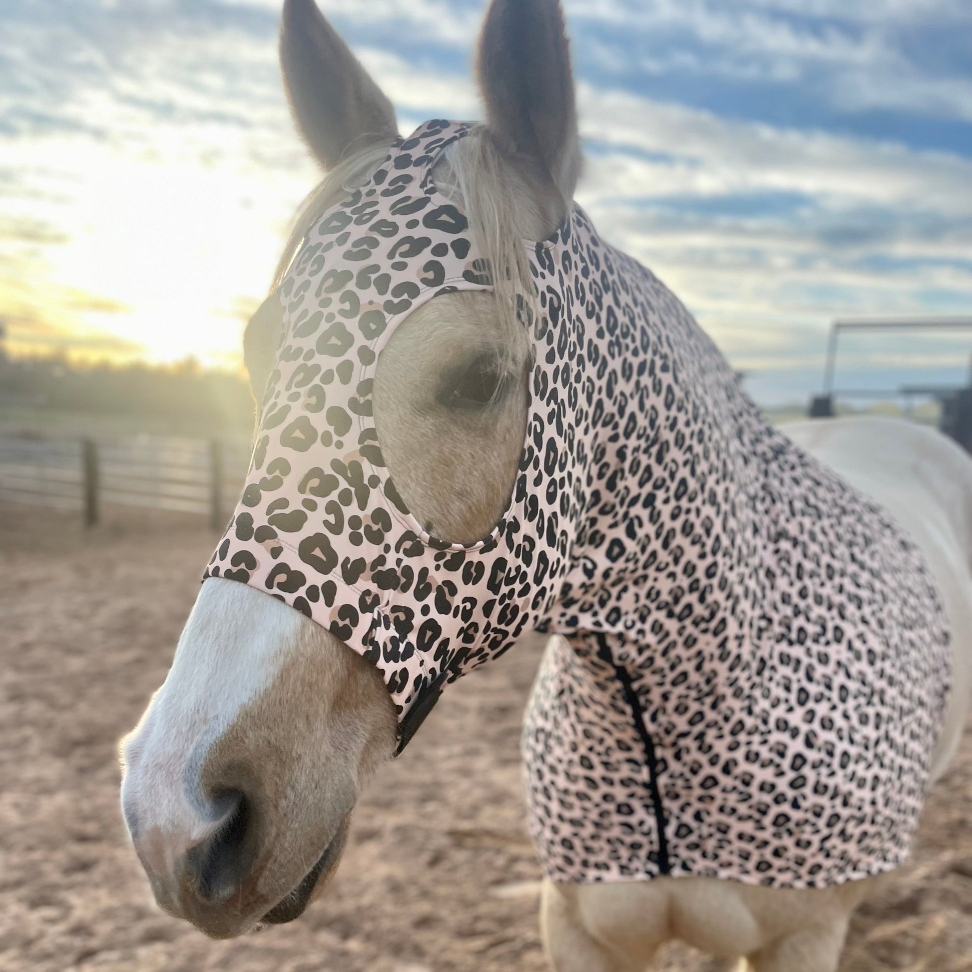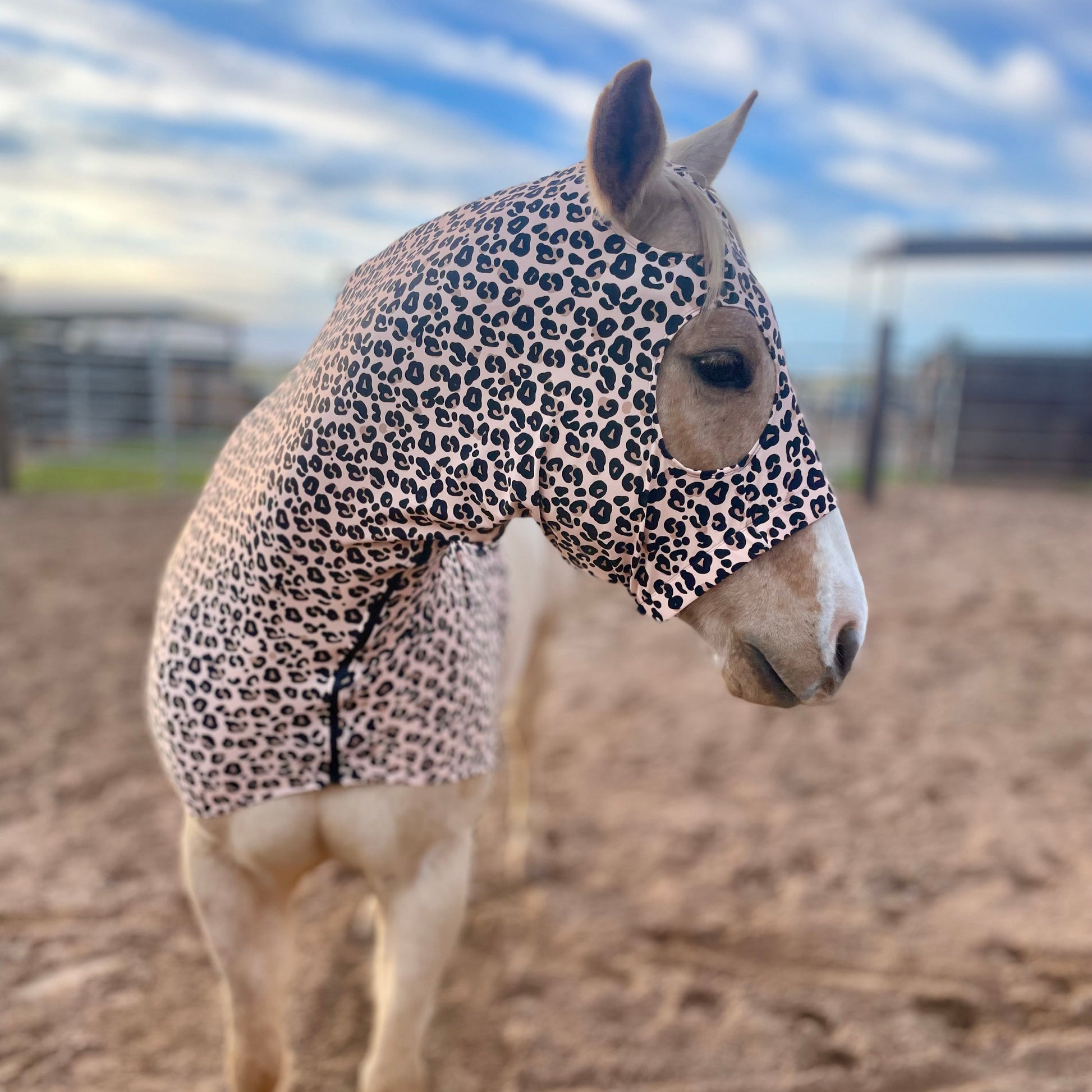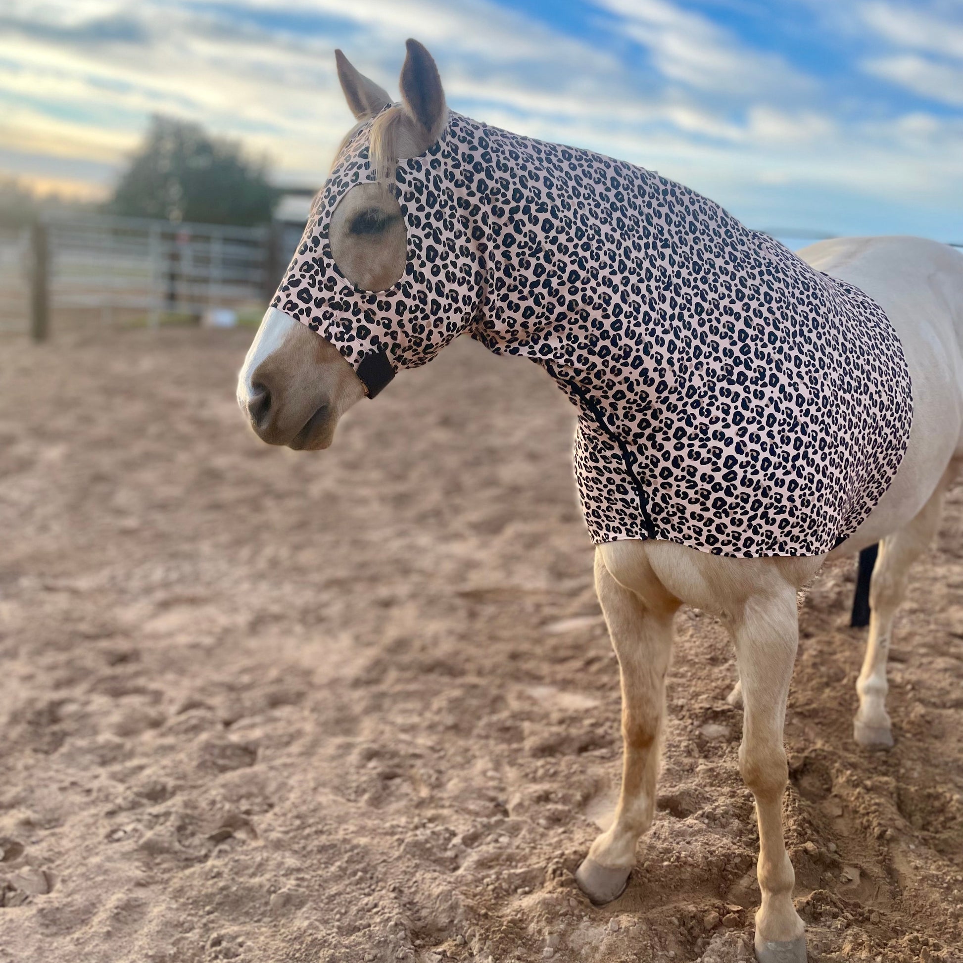 Horse in photo is 15.1 QH, wears size 76” blanket and is modeling a LARGE sleazy hood.