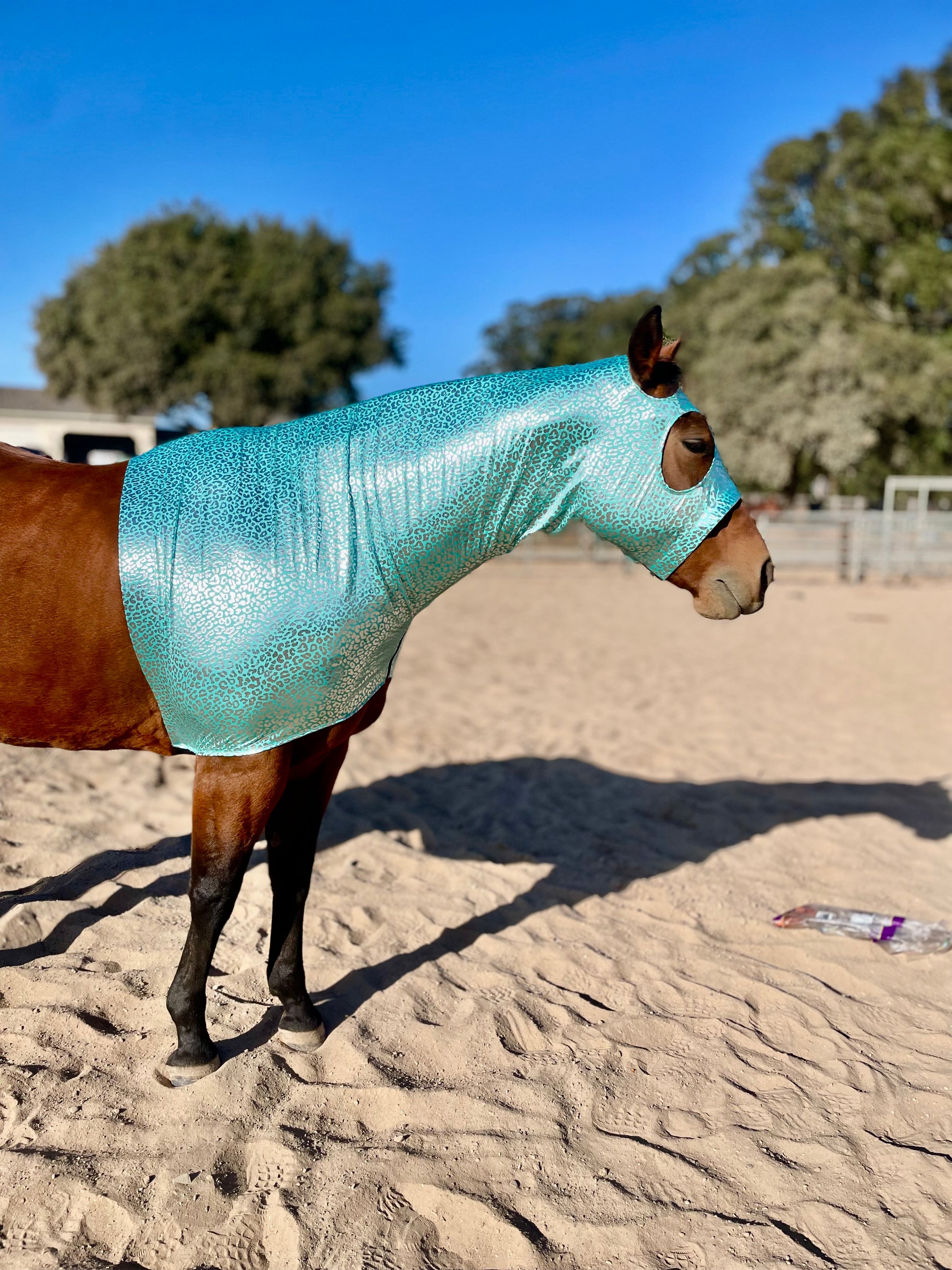 Medium-heavy weight 320g Nylon Lycra material that shines. Generous shoulder lengths to prevent rubs when used used under blankets. Full Separating YKK zipper from chin to chest, adjustable fit 2" noseband with Velcro closure, large eye holes, and heavy duty velcro and elastic bellyband.
